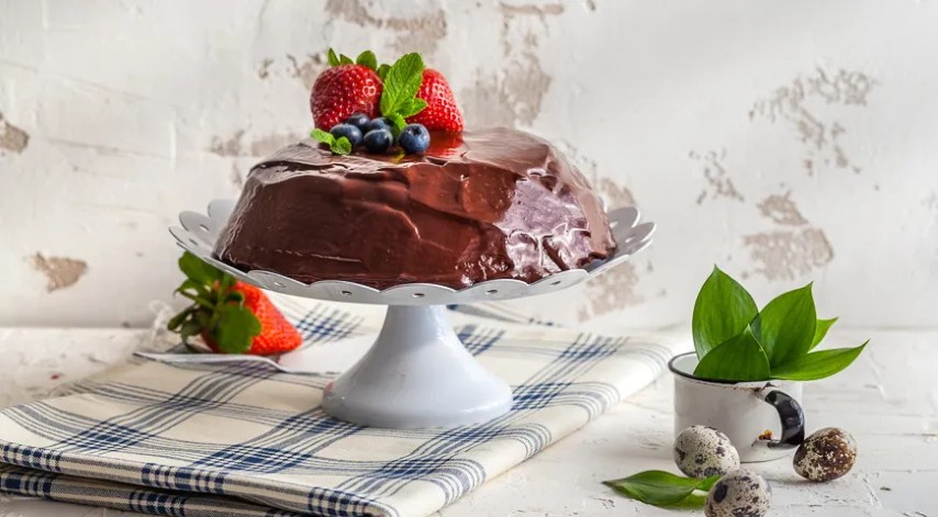 Reikės (10 porcijų): 150 g juodojo šokolado (70 proc.), 20 g sviesto, 200 g margarino kepiniams, 4 kiaušinių, 250 g miltų, 1 šaukštelio kepimo miltelių, 200 g cukraus, 100 g maltų migdolų, 3 šaukštų kakavos miltelių, 1 šaukšto pieno, šviežių uogų – papuošti; kremui: 175 g juodojo šokolado (70 proc.), 150 ml grietinėlės (35 proc.).