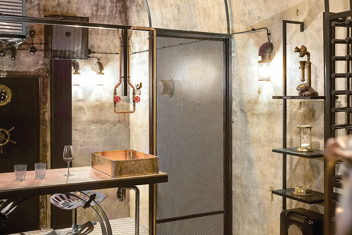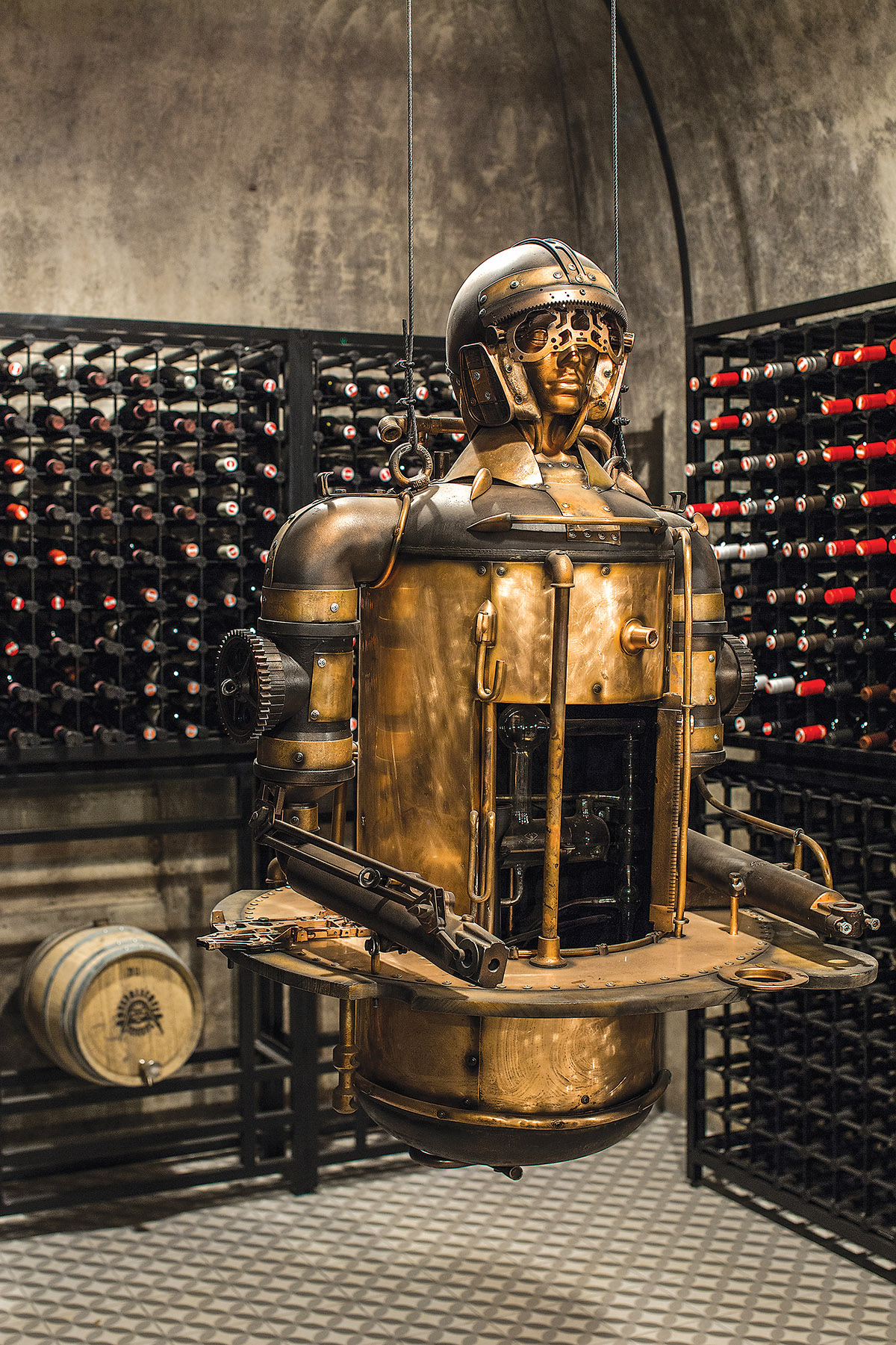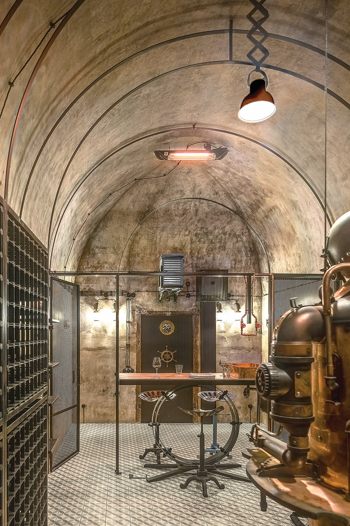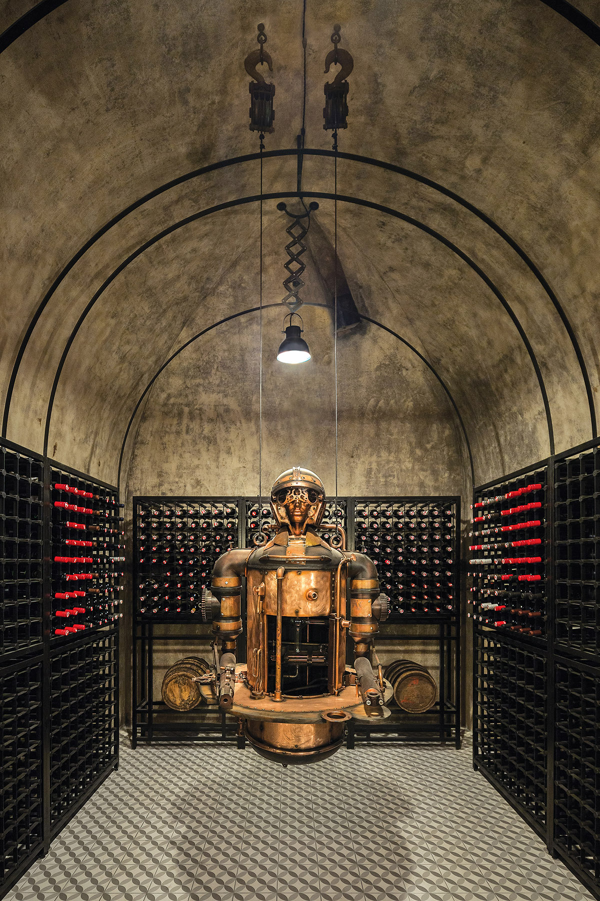 Kaip ir dera, stimpanko stiliaus interjere vyrauja metalas. Patalpą į dvi dalis skiria perforuoto metalo pertvara ir stalas. Už jų – šeimininko vynų kolekcija. Centrinė rūsio ašis – kabanti Balio Tuskulėno sukurta geležinė moters skulptūra. G. Pažarskytė juokiasi, kad užsakovas ją pavadino Gabija interjero dizainerės garbei.