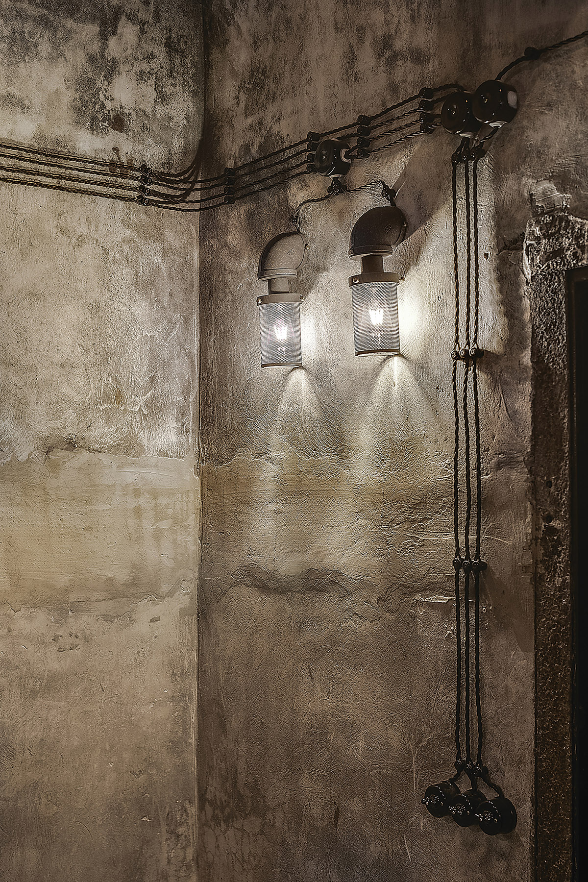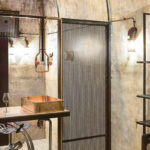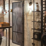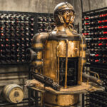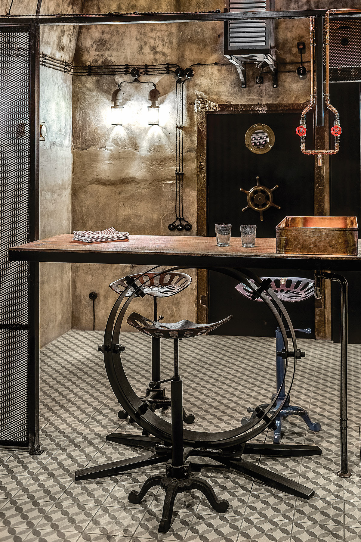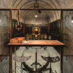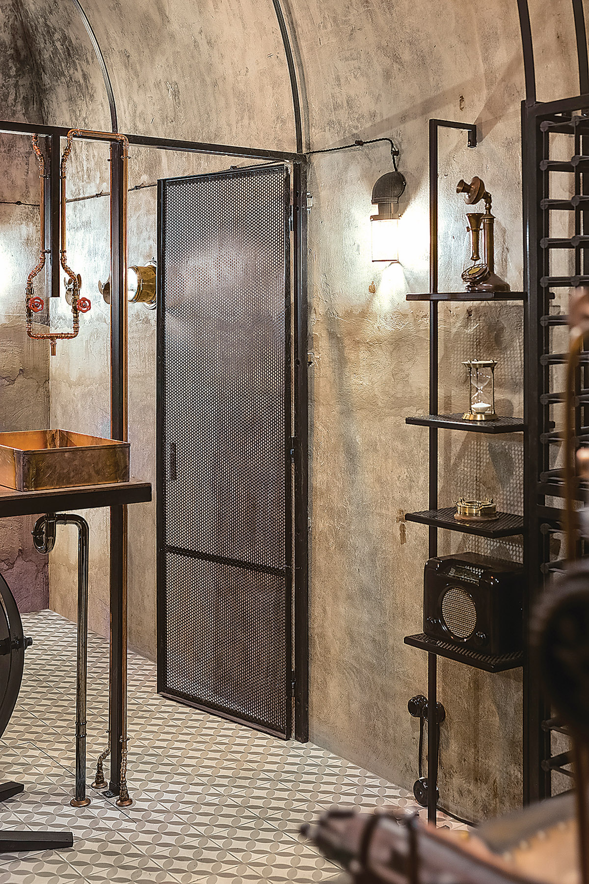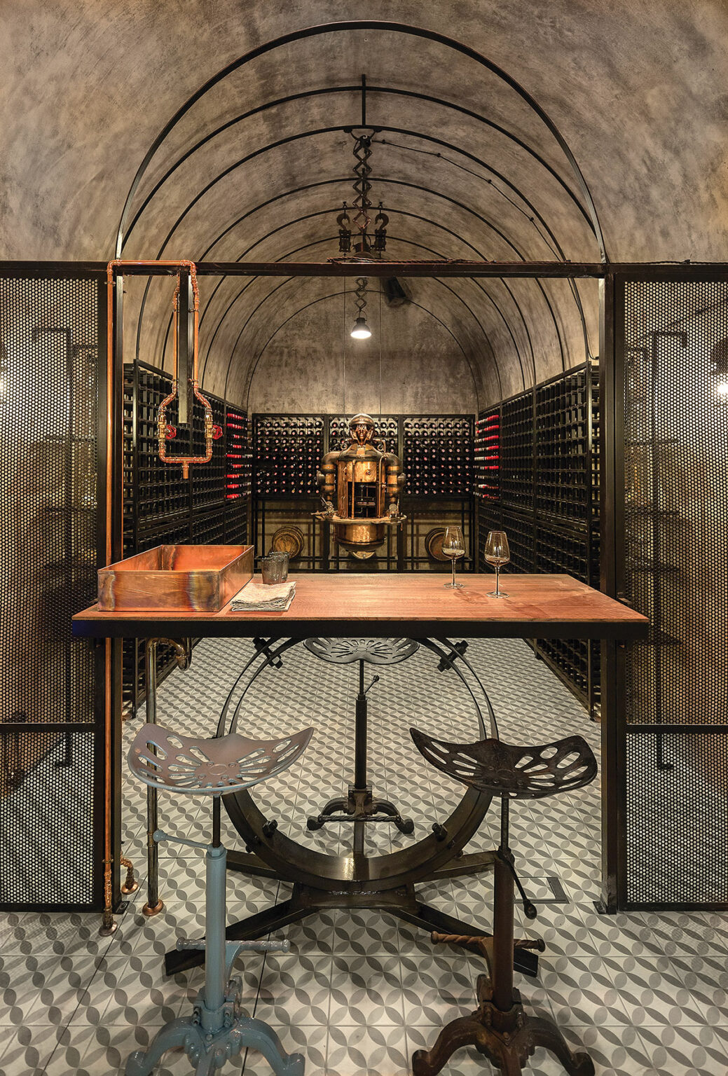 Kaip ir dera, stimpanko stiliaus interjere vyrauja metalas. Patalpą į dvi dalis skiria perforuoto metalo pertvara ir stalas. Už jų – šeimininko vynų kolekcija. Centrinė rūsio ašis – kabanti Balio Tuskulėno sukurta geležinė moters skulptūra. G. Pažarskytė juokiasi, kad užsakovas ją pavadino Gabija interjero dizainerės garbei.