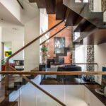 Iš pirmo aukšto fojė laiptais pakilus į antrą atsiveria bendra gyvenamoji erdvė, kurioje sumaniai suformuotos skirtingos funkcinės zonos. Gaminti mėgstantiems ir svečius dažnai priimantiems šeimininkams buvo svarbu erdvi virtuvė ir valgomasis. Svetainėje, kur atsiveria visas pertvarų nedalomas namo sienų aukštis, minkštieji baldai leidžia patogiai įsitaisyti prieš televizorių, židinį ar paganyti akis po kiemą. Trečiame aukšte – privačios šeimininkų valdos: erdvus miegamasis, dvi vonios patalpos, darbo kabinetas ir poilsiui skirtas kambarys: čia dažniausiai praktikuojama joga arba klausomasi muzikos. I. Gelminauskienė sako, kad nuo pat įsikūrimo jų namai savo veido iš esmės nekeitė. Žinoma, juose daugėjo knygų, paveikslų, ant lentynų nutūpė keletas iš tolimų kelionių parsivežtų smulkmenų, bet iš esmės tiek pasirinkti baldai, tiek jų vietos interjere išliko nepakitusios.