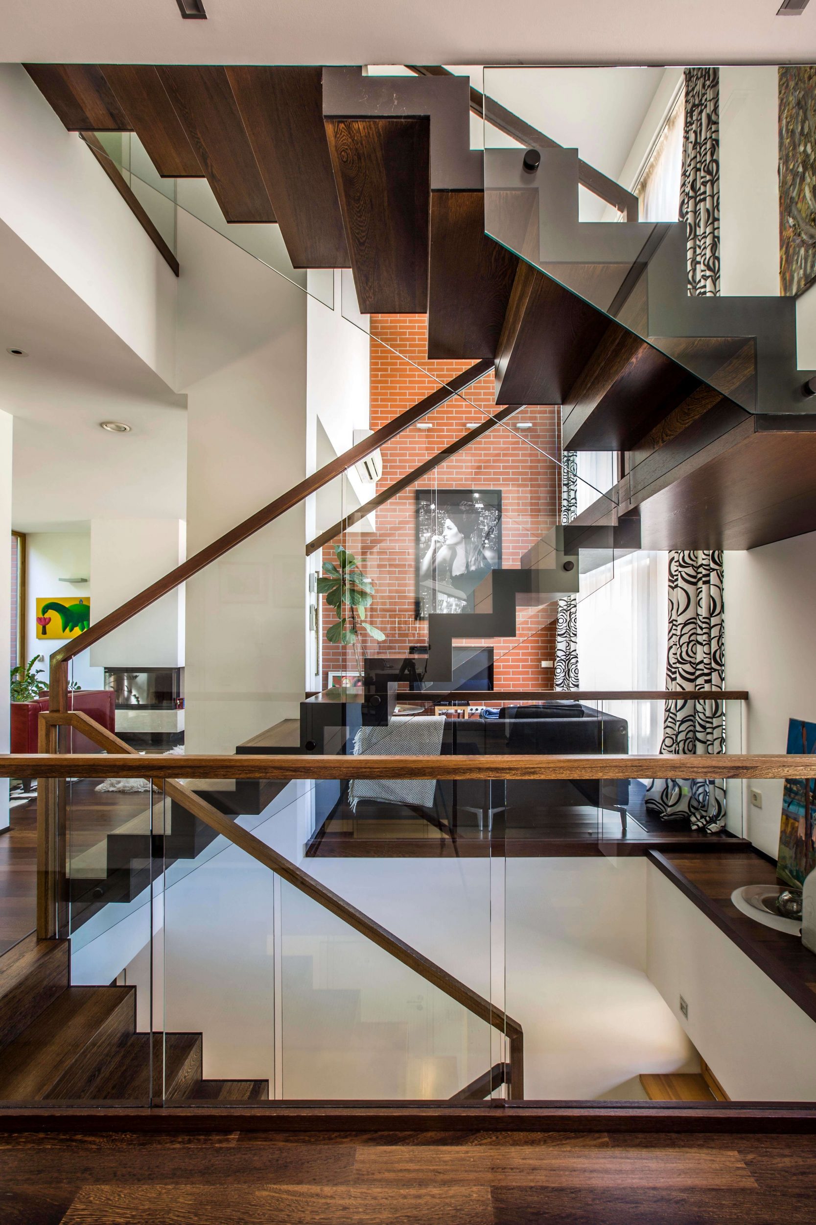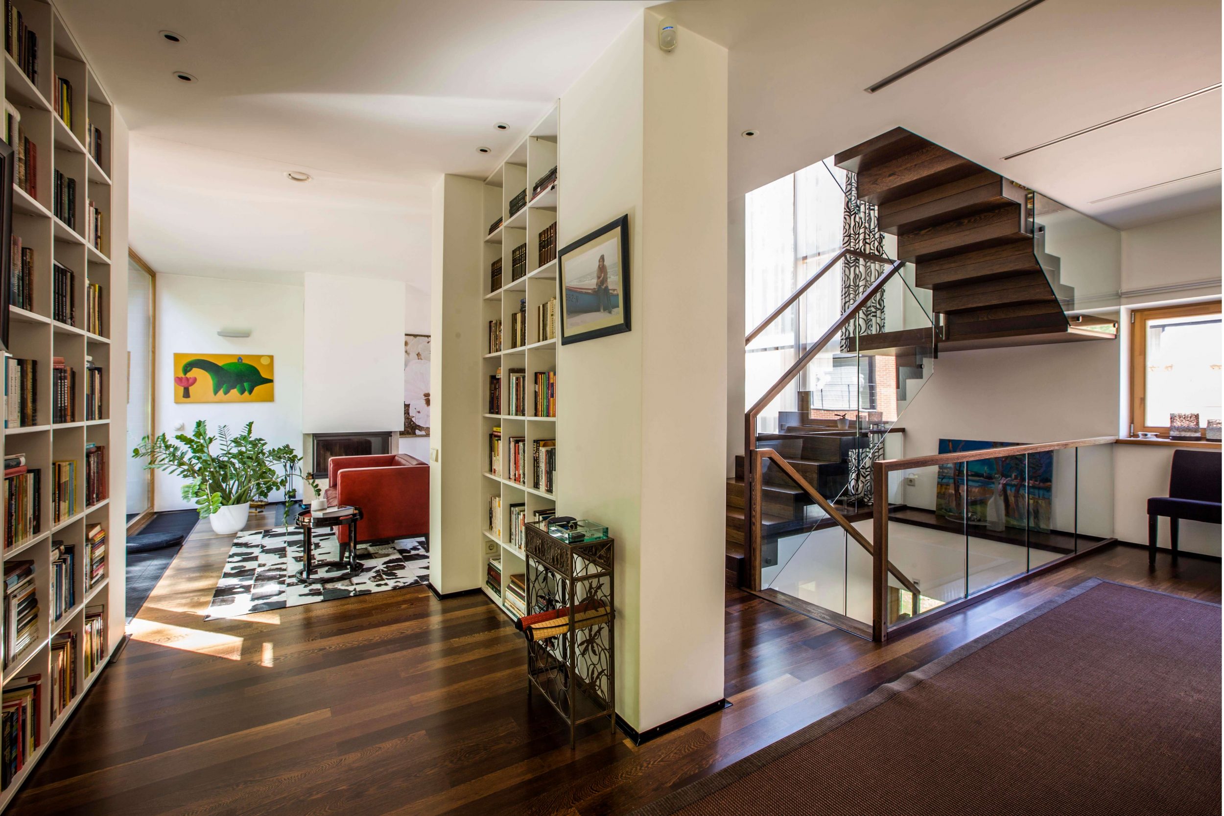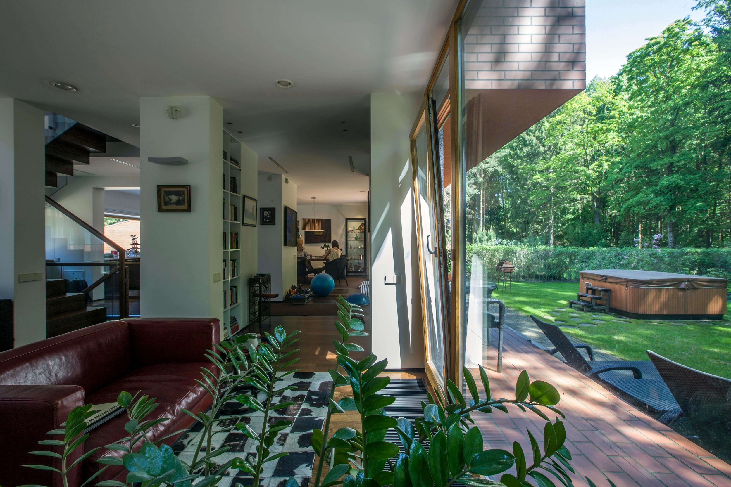 Iš pirmo aukšto fojė laiptais pakilus į antrą atsiveria bendra gyvenamoji erdvė, kurioje sumaniai suformuotos skirtingos funkcinės zonos. Gaminti mėgstantiems ir svečius dažnai priimantiems šeimininkams buvo svarbu erdvi virtuvė ir valgomasis. Svetainėje, kur atsiveria visas pertvarų nedalomas namo sienų aukštis, minkštieji baldai leidžia patogiai įsitaisyti prieš televizorių, židinį ar paganyti akis po kiemą. Trečiame aukšte – privačios šeimininkų valdos: erdvus miegamasis, dvi vonios patalpos, darbo kabinetas ir poilsiui skirtas kambarys: čia dažniausiai praktikuojama joga arba klausomasi muzikos. I. Gelminauskienė sako, kad nuo pat įsikūrimo jų namai savo veido iš esmės nekeitė. Žinoma, juose daugėjo knygų, paveikslų, ant lentynų nutūpė keletas iš tolimų kelionių parsivežtų smulkmenų, bet iš esmės tiek pasirinkti baldai, tiek jų vietos interjere išliko nepakitusios.