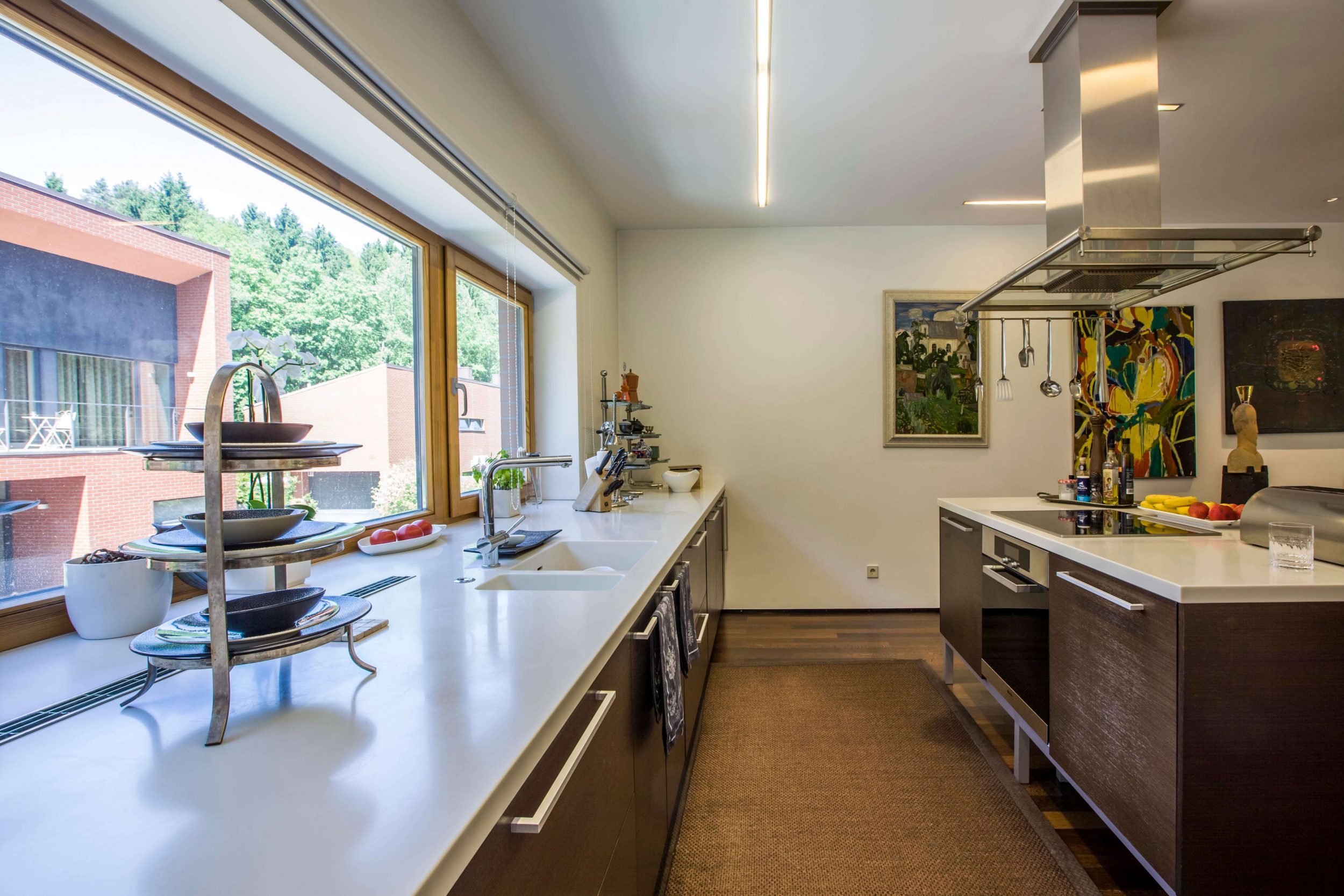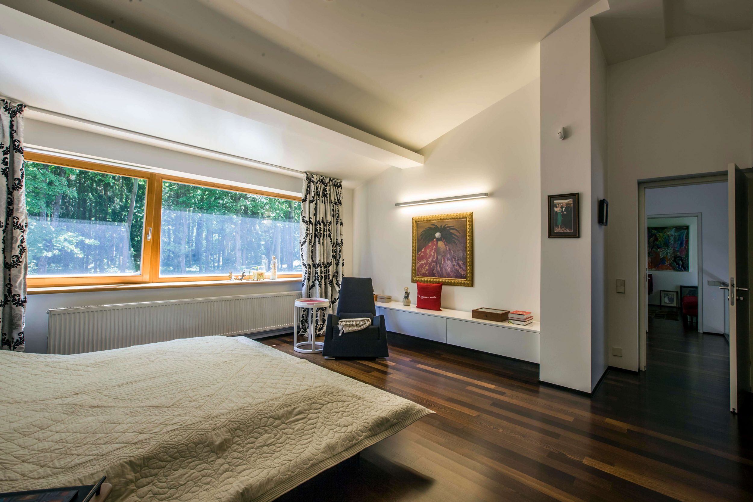 Architekto Gintaro Kuginio projektuotų individualių namų kvartalas atitiko esminius lokacijos kriterijus, kuriuos kėlė tuomet būsto besižvalgę verslininkai Ingrida ir Simonas Gelminauskiai: jis buvo arti gamtos, bet ir arti miesto centro. Iš tiesų Rotušės aikštę iš namų prireikus paprasta pasiekti pėsčiomis. Taip pat paprasta čia gyvenant užmiršti sostinės šurmulį: būsto kiemas remiasi į miško teritoriją, prie tvoros užklysta stirnų, lapių, o naktimis suūbauja pelėda.
