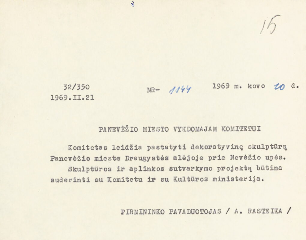 Valstybinis statybos reikalų komitetas tų pačių metų kovą Panevėžio miesto vykdomąjį komitetą informavo leidžiantis minėtoje vietoje skulptūrą statyti. Tik nurodė, kad skulptūros ir aplinkos sutvarkymo projektą reikės suderinti su Statybos reikalų komitetu ir Kultūros ministerija.