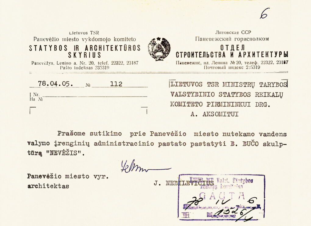Vis dėlto, sako L. Kaziukonis, Šiaulių regioninio valstybės archyvo Panevėžio filiale pavyko rasti keletą dokumentų, iš kurių matyti, kad 1969 metų vasario 21 dieną Panevėžio miesto vykdomasis komitetas raštu kreipėsi į Valstybinį statybos reikalų komitetą dėl sutikimo pastatyti dekoratyvinę skulptūrą naujai suplanuotoje aikštėje prie Draugystės alėjos – dabartinės A. Jakšto gatvės.