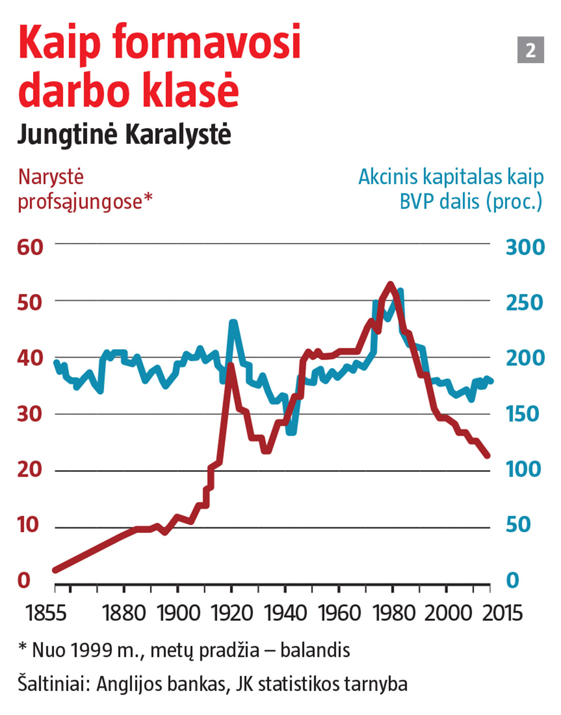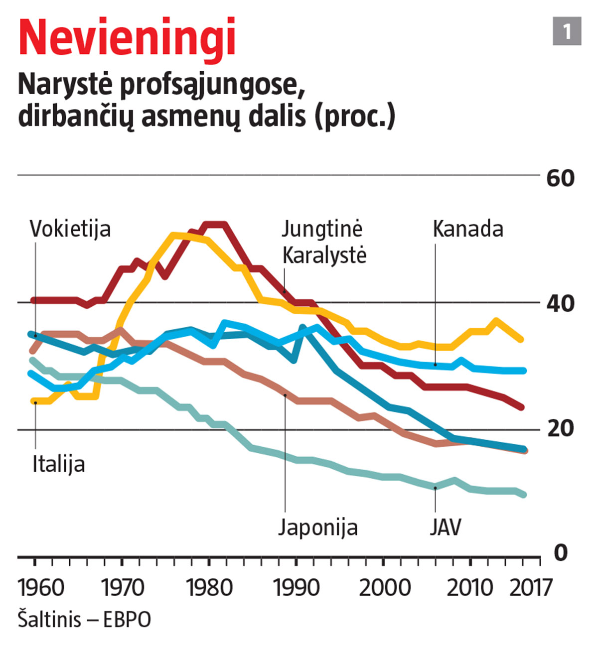 Neatrodo, kad profsąjungos galėtų atsigauti. Iki XIX a. vidurio darbininkai retai būrėsi į tokias grupes, bet vėliau industrializacija ir urbanizacija suvedė darbininkus į krūvą, tad atsirado ir proga, ir priežastis organizuotis – derėtis dėl užmokesčio ir sąlygų. 1915 m. jau 10 proc. dirbančių amerikiečių buvo profsąjungų nariai, o apie 1950 m. narystė pasiekė 30 proc. piką. Švedijoje narystės lygis 1930 m. buvo apie 40 proc., o Jungtinėje Karalystėje tiek pat – gerais pora dešimtmečių vėliau, kai įvairioms profsąjungoms priklausė 10 mln. darbininkų. Staigus nykimas nustebino beveik visus. Turtingose šalyse narystė profsąjungose nėrė žemyn (žr. 1 grafiką). Šiandien tik vienas iš dešimties dirbančių amerikiečių priklauso profsąjungai. Ekonominio bendradarbiavimo ir plėtros organizacijai priklausančiose šalyse narystės mediana siekia apie 18 proc., o XX a. 9-ojo dešimtmečio pradžioje viršijo 50 proc.