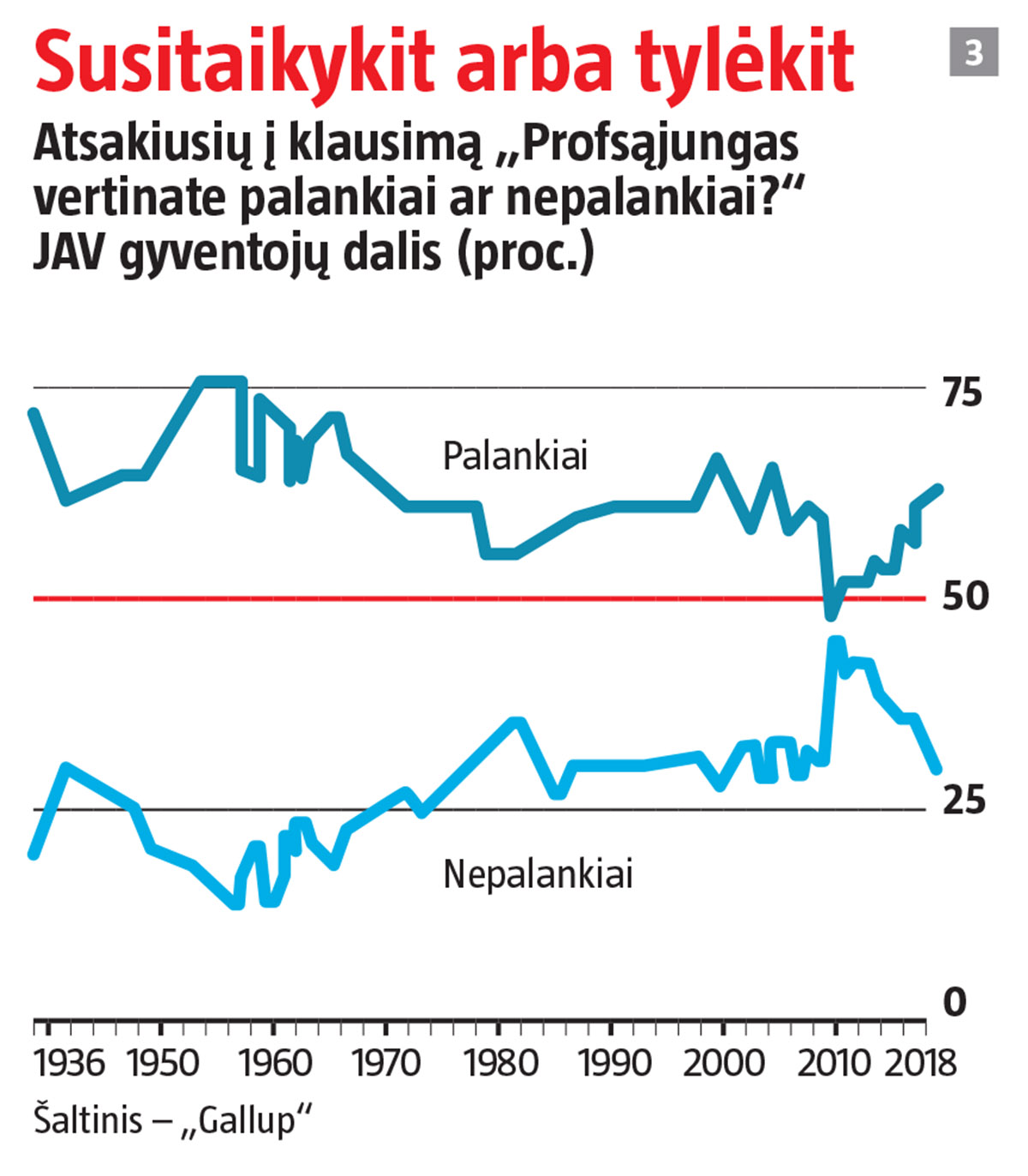 Nors nauda darbuotojams nėra tiksliai aiški, vėl atsiranda daugiau pritariančių organizuotai darbo jėgai (žr. 3 grafiką). O gaivinant profsąjungas technologijos vėl gali tapti pagrindinėmis pagalbininkėmis – ypač JAV, kur aktyvistai bando išradingas darbininkų organizavimo naujoves.