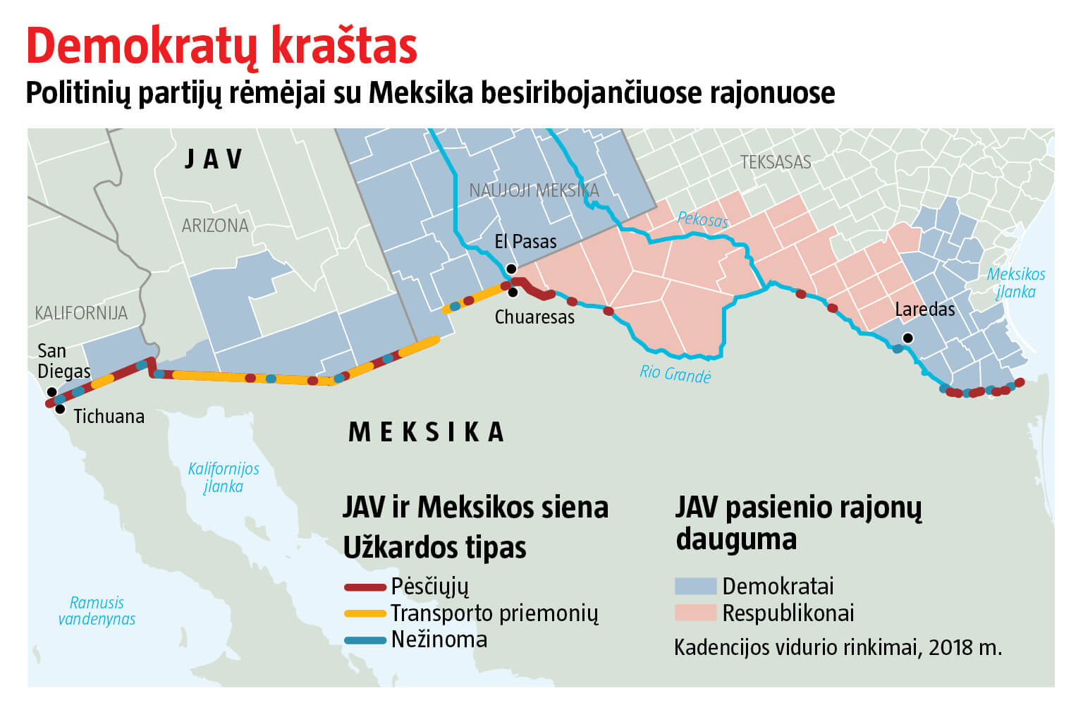 Pasak El Paso mero Dee Margo, jis mieliau skirtų pinigus ne tvorai, o personalo skaičiui padidinti, kad būtų lengviau susitvarkyti su dešimtimis tūkstančių žmonių, automobilių ir sunkvežimių, kasdien kertančių sieną. Jis – ne vienas. Kongrese visi, išskyrus vieną, nariai iš pasienio rajonų yra demokratai (žr. žemėlapį), ir visi, įskaitant vienintelį respublikoną, nepritaria D. Trumpo sienai. Nors bauginama žiauriais imigrantais, 22 iš 23 pasienio apygardų yra saugesnės už panašaus dydžio apygardas kitur.