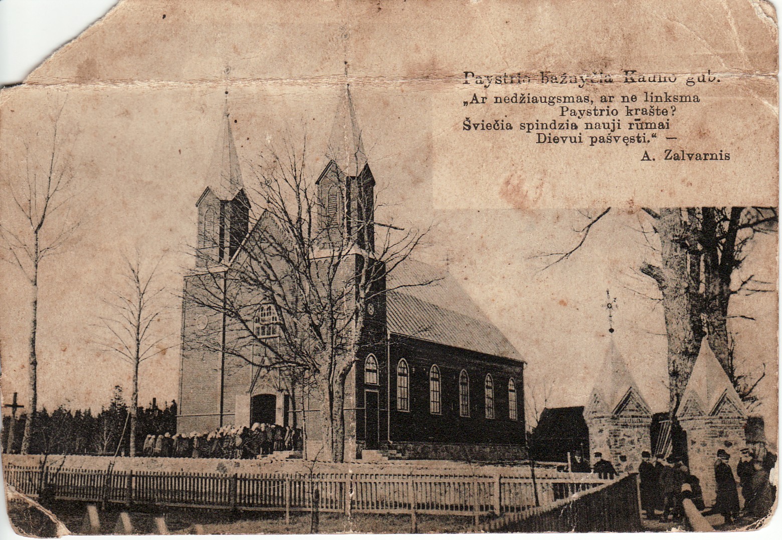 Štai kaip jis aprašė paįstriečių pasirengimą bažnyčios statybai: „Broliuk! Paįstriečiai nei kiek neištežę,/ Bažnyčiai jau medžių jie turi privežę/Tik laukia leidimo statyt kas valandą,/O pypkę užkūrę kirvius jau galanda.“
