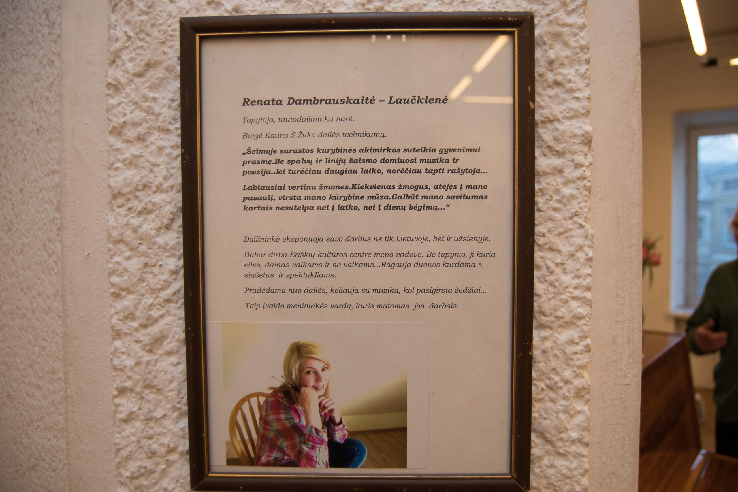 Ėriškių kultūros centro meno vadovė Renata Laučkienė iki pirštų galiukų paskendusi meno pasaulyje. Ji ne tik tapo, bei ir kuria eiles, dainas vaikams ir suaugusiems bei siužetus spektakliams.