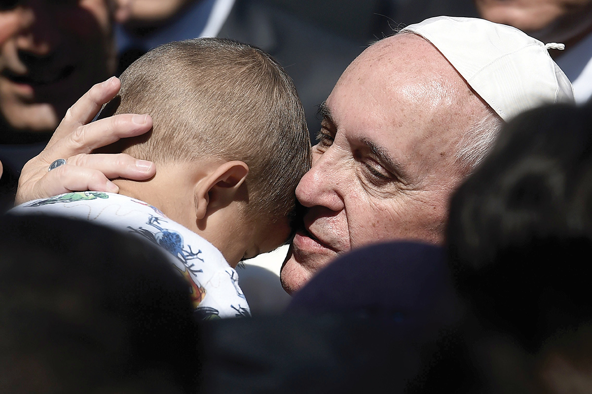 Popiežius bučiuoja vaiką pabėgėlių sulaikymo centre Lesbo saloje, Graikijoje. (Scanpix nuotr.)