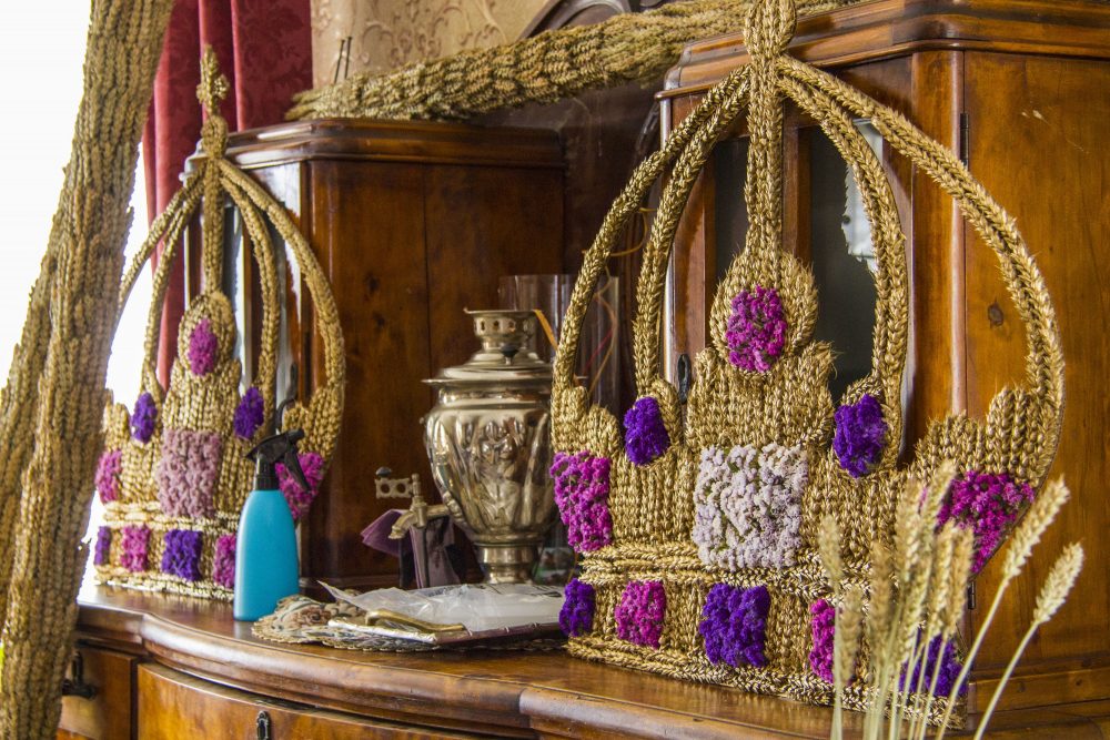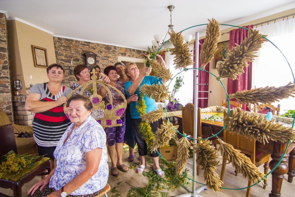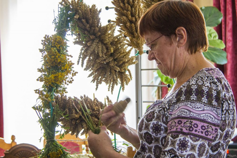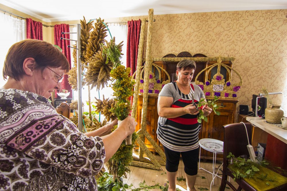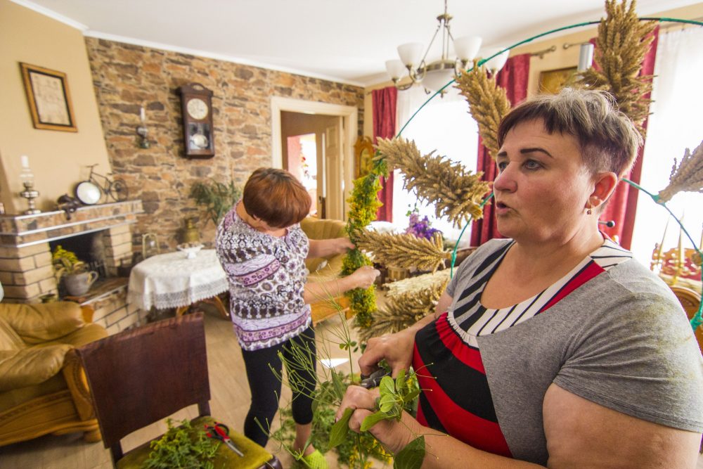 Sekmadienio vakarą „Sekundės“ korespondentams užsukus į išskirtinę sodybą čia darbas virte virė. Troboje būrys moterų kruopščiai, ryšelis po ryšelio prie I. Rudienės šeimos vyrų – sutuoktinio ir dviejų sūnų – sumeistrauto saulutės karkaso rišo bitkrėsles, javų šluoteles, derino žalumynus, vis pasitardamos, pasvarstydamos ir pasiguosdamos, kad Krekenavoje per maža ryškiaspalvių šermukšnių. Čia pat pūpsojo glėbiai iš vietos ūkininkų ir žemės ūkio bendrovės laukų pririnktų javų, Nijolės Adamkevičienės pavasarį specialiai Žolinės atlaidams pasėtų violetinių, mėlynų sausiukų.