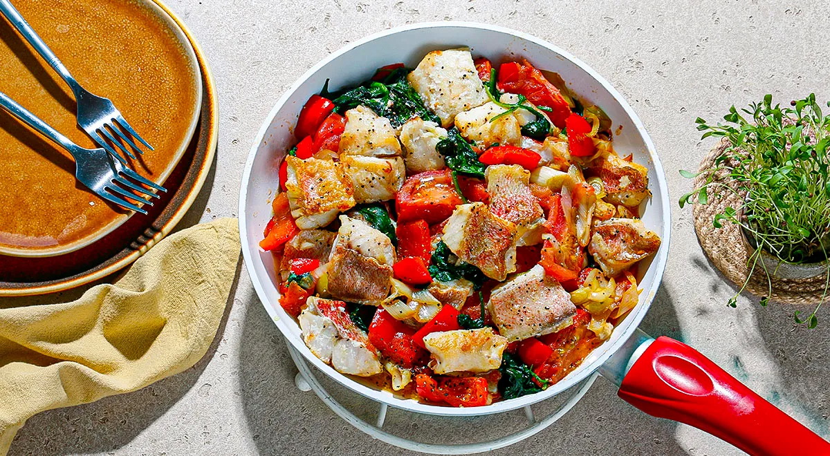 Reikės (4 porcijoms): 800 g jūros ešerio filė, 100 g špinatų, 1 poro, 2 pomidorų, 1 raudonos paprikos, 2 šaukštų aliejaus, druskos, maltų juodųjų pipirų.