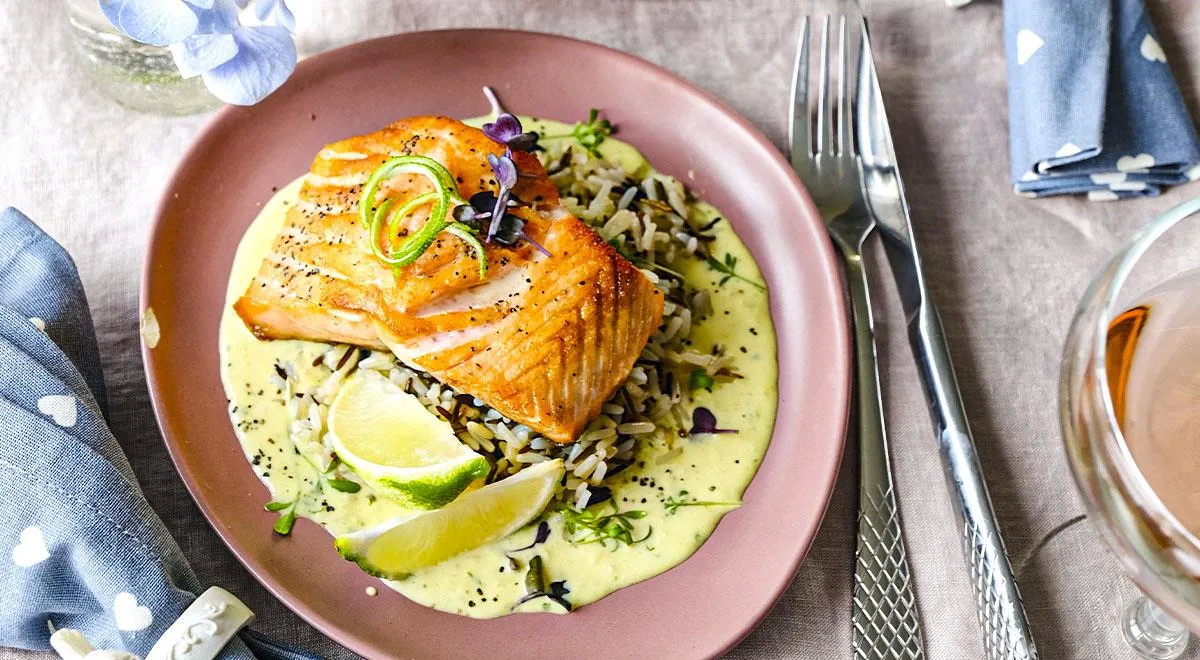 Reikės (2 porcijoms): 2 lašišos filė gabaliukų po 200–250 g, 200 g ilgagrūdžių ir laukinių ryžių mišinio, 2 šaukštų aliejaus, 30 g sviesto, šviežiai maltų juodųjų pipirų, druskos, žaliųjų citrinų – patiekti; kariui: 250 ml vištienos sultinio, 150 ml kokosų pieno, 2 šaukštų žaliosios citrinos sulčių, 1 šaukštelio tarkuotos žaliosios citrinos žievelės, 2 svogūnų, 2 česnako skiltelių, 3 cm imbiero šaknies, 1 žalios aitriosios paprikos, 5 kalendros šakelių, 2 šaukštų aliejaus, 1 šaukštelio cukraus, druskos.