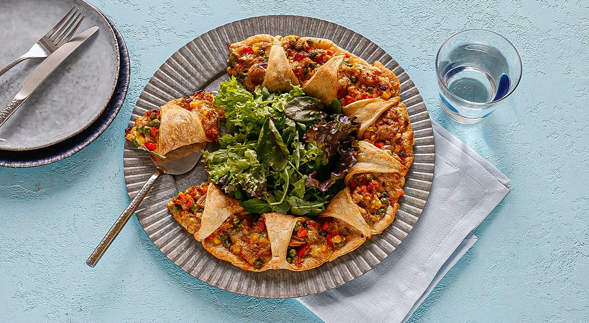 Reikės (4 porcijoms): 250 g sluoksniuotos bemielės tešlos, 340 g tuno savose sultyse, 50 g kietojo sūrio, 150 g šaldytų daržovių mišinio, 2 šaukštų majonezo, druskos, maltų juodųjų pipirų.