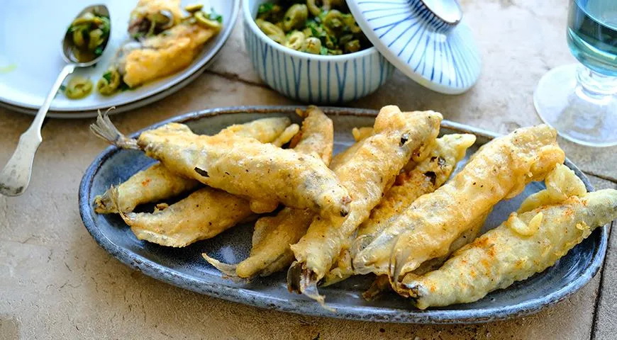 Stintenių tempura su alyvuogių padažu