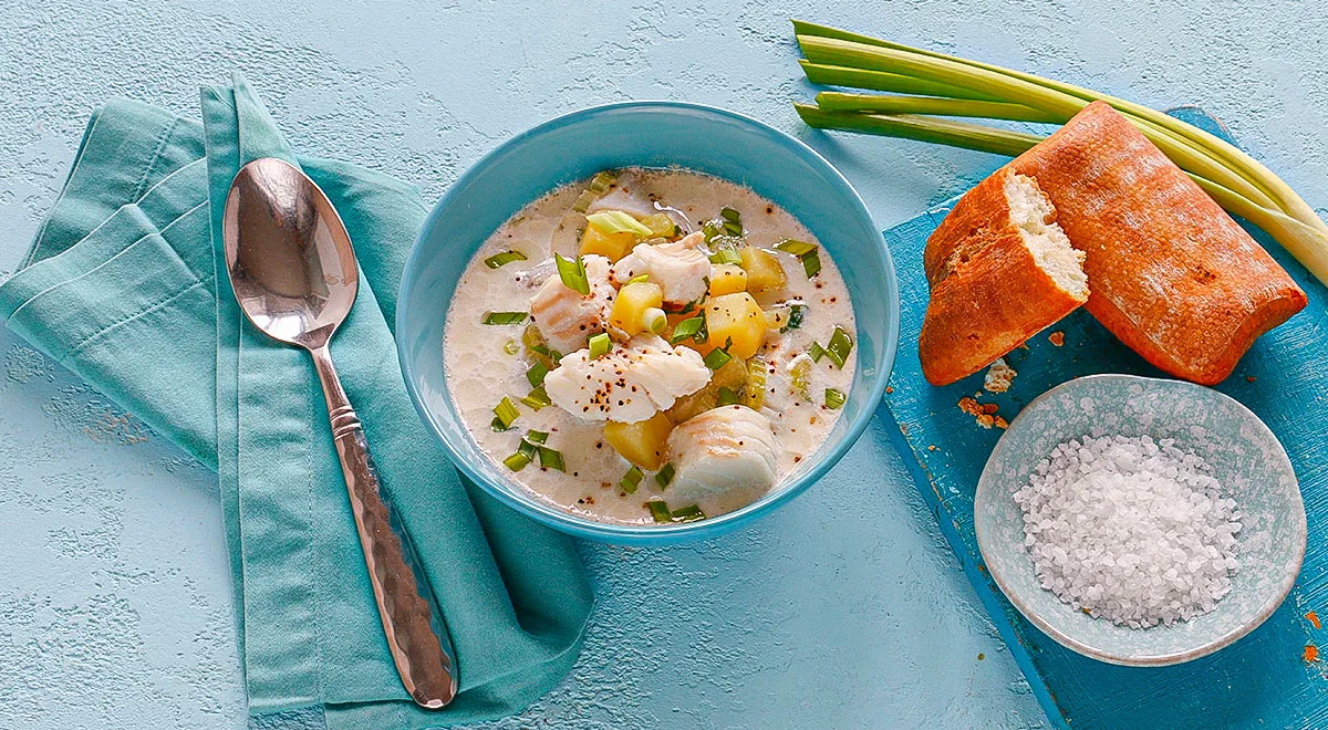 Reikės (4 porcijoms): 400 g menkės filė, 450 g bulvių, 200 ml grietinėlės, 10 g svogūnų laiškų, 2 salierų stiebų, druskos, maltų juodųjų pipirų.