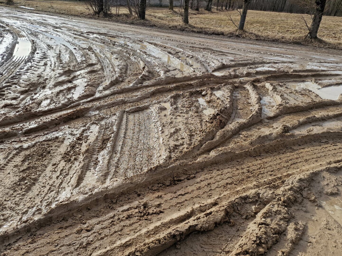 „Kiek mačiau, jie bandė greideriuoti, bet kol kas per daug šlapia ir nieko gero iš to neišėjo, nes duobės tapo tarsi spąstais – per vandenį nematyti, kur jos, o visas paviršius – ištisa košė“, – sako seniūnė.