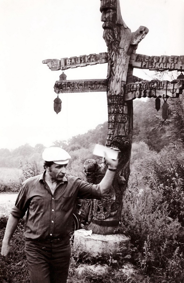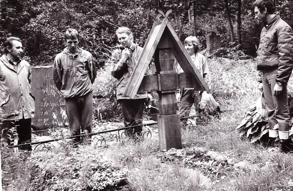 Žygeiviai kelia į medį koplytėlę. 1986 metai. V. BEINORTIENĖS ASMENINIO ARCHYVO nuotr.