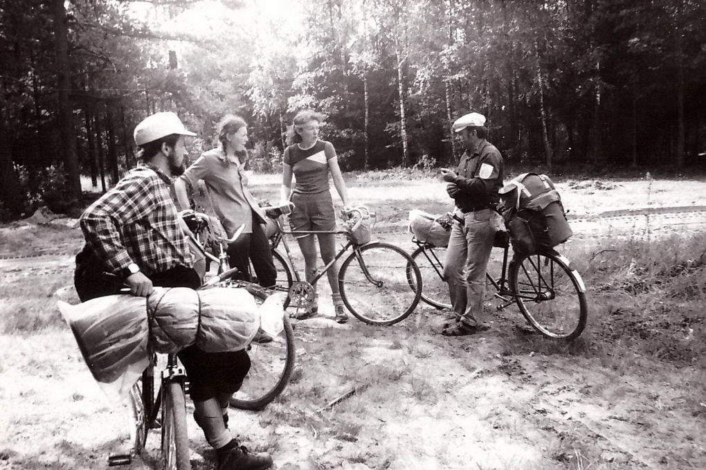 Julius Beinortas dviračių žygyje Durbė–Pabaiskas 1985-aisiais ir metais anksčiau – žygeiviai prie Gabrielės Petkevičaitės-Bitės tėvo Jono Petkevičiaus kapo Laimučiuose. Iš dešinės – B. Chormanskis, Julius Beinortas, V. Juškevičius, R. Mažylienė. V. BEINORTIENĖS ASMENINIO ARCHYVO nuotr.