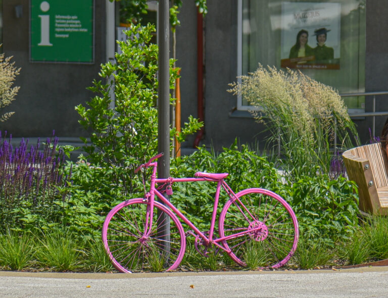 Atnaujintoje Laisvės aikštėje, prie fontano, jau kurį laiką dėmesį atkreipiantis rožinis dviratis…